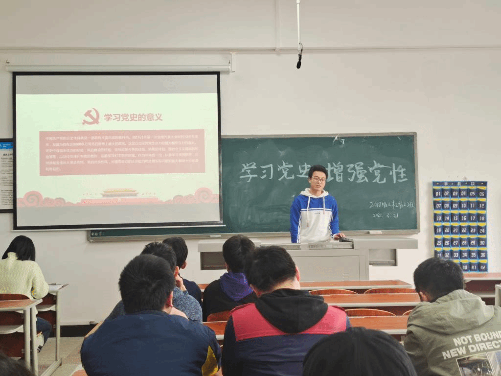 3月21日,76net必赢线路检测中心党总支学生党支部党员向阳平在慎思楼 5栋421教室以“学习党史 增强党性”为题,为2018级土木工程专业2班全体党团员讲党史“微党课”。