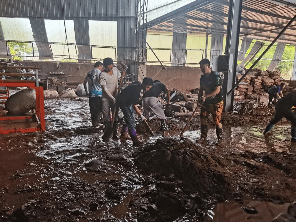 学生党支部书记杨楠、尹鸿带领大家前往长岭镇泳昌护栏厂,现场淤泥深厚、积水较多,空气中弥漫着难闻的气味。党员老师们带头冲锋,同学们紧随其后,充分发场土木学子不怕苦,不怕累的精神,踏进厚厚的淤泥中,拿起扫把、铁锹等工具,分片包干,分工协作,清理洪水过后形成的淤泥、积水、垃圾,从车间中抢运生产物资,虽然脸上满是汗水、衣服粘上泥浆、手掌磨出了血泡,但大家始终热情高涨,干劲十足。