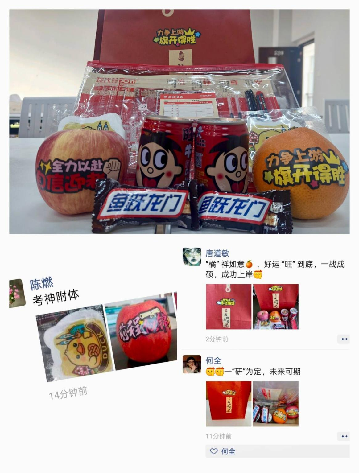 活动最后,慰问团将一份份承载着美好祝愿的“暖心加油包”递到同学们手中。礼包内有寓意“旺”气冲天的旺仔、好事发生的巧克力、一战“橙”硕和“苹”稳上岸的水果以及实用文具。“同学们辛苦了!”“坚持就是胜利!”“相信自己,一‘研’为定!”一声声亲切的问候,一句句真诚的叮咛,瞬间驱散了冬日的寒意,温暖了每一位学子的心田。活动结束后,同学们也纷纷在朋友圈分享收到此份关怀与祝福,并表示学院的关怀如同冬日暖阳,让人倍感振奋,他们将把这份感动转化为前进的动力,调整好状态,全力以赴,以优异的成绩回报学院的培养与期待。