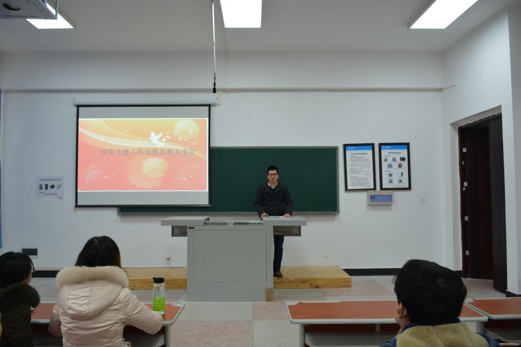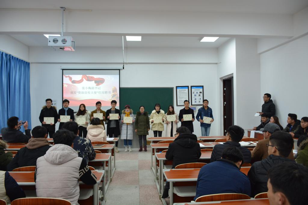 会上,张小梅副书记为“国家励志奖学金宣传大使”颁发聘书。文学老师详细介绍了国家资助政策和我校资助政策体系、资助工作开展情况,让同学们更深入、全面地了解了最新的资助政策。王刚老师介绍了“国家励志奖学金宣传大使”工作职责和任务。洪副书记安排了学院宣传部及勤工助学部的资助宣传工作,同时,他指出,从各级政府到学校,多类别的资助政策、多覆盖的群体认定、不断增加的资助金额无不表达和体现了国家、社会和学校对贫困学子的爱心与责任、希望与寄托,望同学们不忘初心,怀着感恩的心,回报父母,回馈社会;以怀揣新时代高校大学生的使命感,以优异的成绩,常怀感恩之心,常行感恩之行,做一个合格的社会主义接班人。