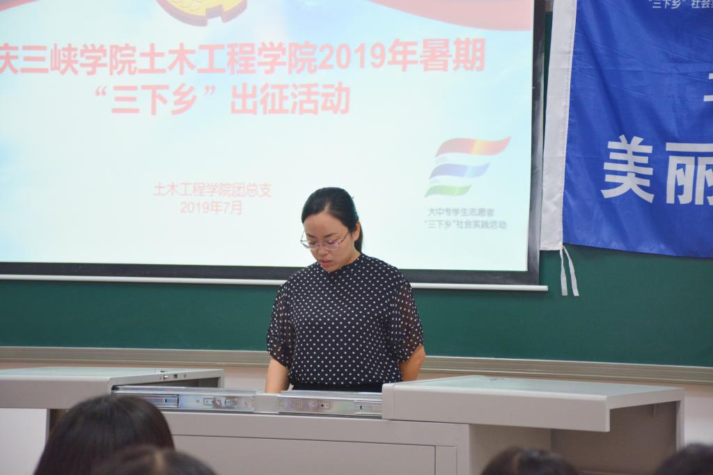 首先张小梅书记进行动员讲话,她希望土木学子以饱满昂扬的精神状态和健康文明的时代形象参与暑期“三下乡”活动,并对同学们提出了三点要求:在实践中践行青春使命,在服务社会中彰显人生价值,做志向远大的时代青年;在艰苦环境中磨练意志品质,在实践和向群众学习中增长才干,做艰苦奋斗的时代青年;牢记暑期社会实践安全条例,听从指挥和安排,做令行禁止的时代青年。