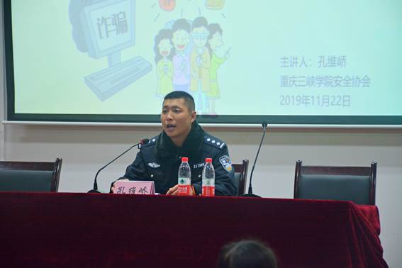 为切实增强学生的安全意识,提高学生的安全防范技能,11月22日晚,76net必赢线路检测中心特邀万州区公安民警孔维峤警官作为讲师,在明辨楼2栋106报告厅举办了以“普及防诈骗知识,增强自我安全意识”为主题的大学生防诈骗安全知识讲座。讲座由辅导员谭平老师主持,200余名学生到场聆听。