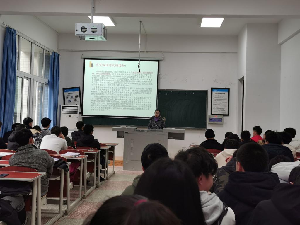 会上,张老师传达了学校严肃考规考纪的工作要求,通报了近期学校对考试违规违纪学生的处分决定,强调了考试的严肃性以及考试违规可能造成的后果。张老师指出,期末考试是一个学期以来教和学的总结,是对一个学期以来学习的一次检阅,是我们评价同学们一个学期学习情况的重要依据,通过期末考试可以反思学习过程,发现学习问题,研究学习方法,进而改进和调整学习策略,提高学习质量,以达到师生共同进步的目的。要求全体同学要严守考试纪律,坚持诚信考试,杜绝考试作弊,培养良好的诚信道德品质,做诚信考试的践行者。