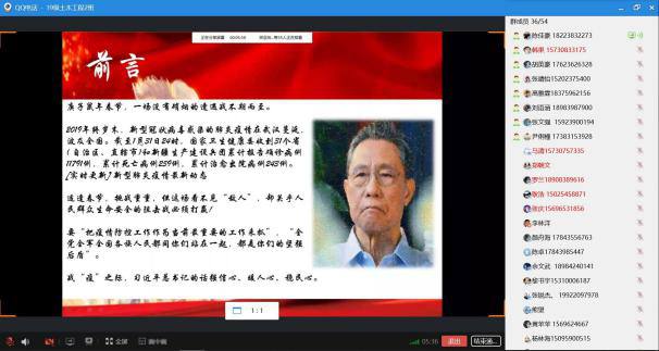 各班级集中观看了《最美逆行者》、《打响共同战疫,致敬疫情前线医护人员》等视频,学习了抗击疫情的先进典型事迹。同学们积极撰写心得体会,表达对抗疫一线的无名英雄表达最崇高的敬意,也向祖国和武汉表达了自己最真挚的祝福。团支书们呼吁同学们以“逆行者”为榜样,充分发挥共青团员的先锋带头作用,共同期待美好春天的到来。同学们纷纷表示,将会严格遵守学校关于疫情防控安排和教学工作的要求,合理安排“宅”在家的生活和学习,认真参加网络学习,停课不停学,自我提升不掉线。