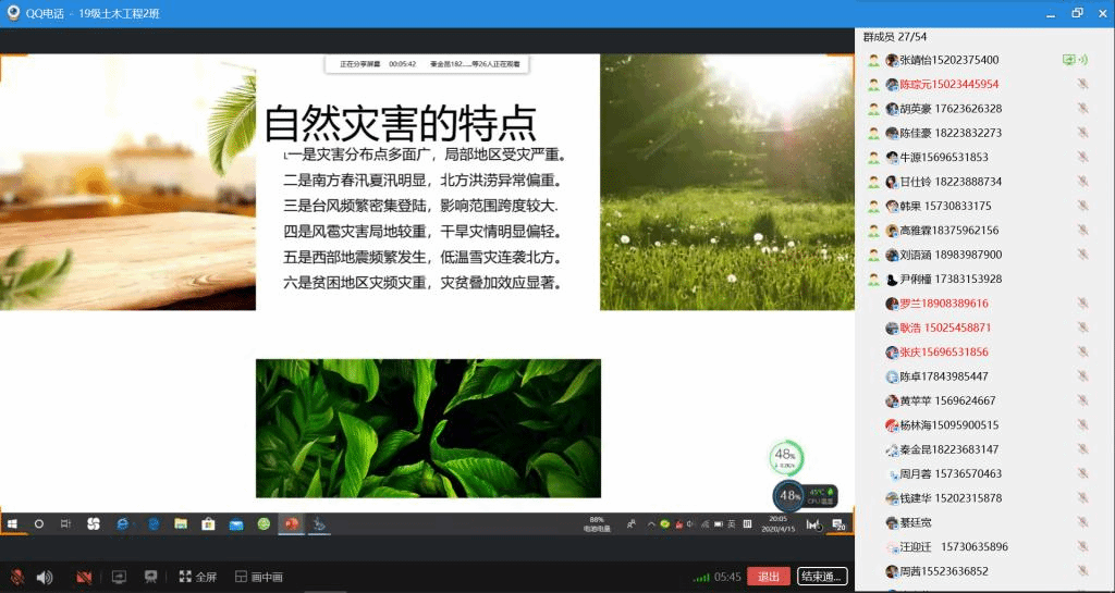 为有效预防学生事故的发生,提高同学们防灾避险的意识和能力,76net必赢线路检测中心2019级各班于4月15-16日在辅导员谭平的组织下开展“防汛抗旱”线上主题班会。