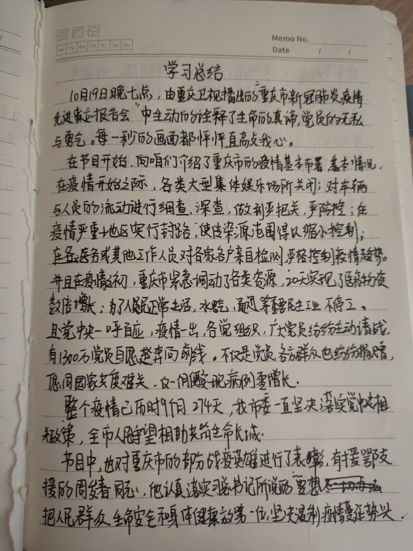 在团学会的组织下,同学们通过直播、回放的形式对报告会进行观看学习。会议中播放的短片,把人们带回到那片没有硝烟的战场。一幅幅动人的画面,清晰地记录了我们国家、我们党对生命的尊重,以及重庆人民在疫情中迸发出的无私、无畏、无悔和大勇、大爱、大义。报告会上,周发春、黄霞、简富琼、余建、宿昆、刘雪梅、潘继明、连新民、王华伦9位获得全国和全市表彰的抗击新冠肺炎疫情的优秀共产党员和先进个人,向大家分享了他们的抗疫事迹,向我们展示了心系群众、勇于担当、无私奉献的精神风貌,用满腔的热诚与强烈的责任感,诠释了重庆担当、重庆精神。