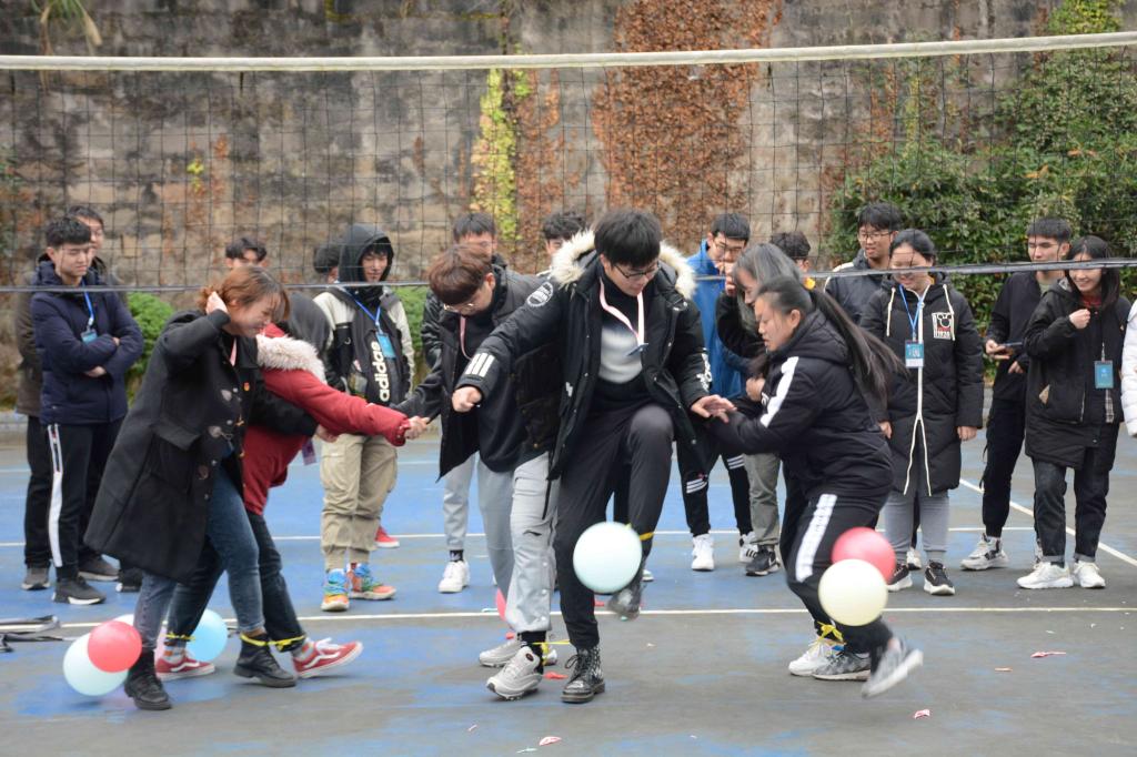 活动共由双人抢瓶子、膝盖传纸、两人三足踩气球三个游戏组成。游戏开始前,心理健康协会和大学生就业协会的工作人员进行游戏示范。各组学员积极参与游戏,在激烈而又轻松的竞争氛围中驱走了寒意,温暖了心灵。