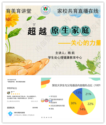 为落实立德树人根本任务,深化学生心理健康教育工作,发挥心理育人作用,形成有效家校凝聚力,帮助家长科学有效地与孩子沟通,促进学生成长成才,10月15日晚,学院特邀学生处心理健康教育中心咨询师杨航在腾讯课堂开展了以“超越原生家庭——关心的力量”为主题的线上家长会。家长会由辅导员杨楠主持,学院各年级学生家长参加。