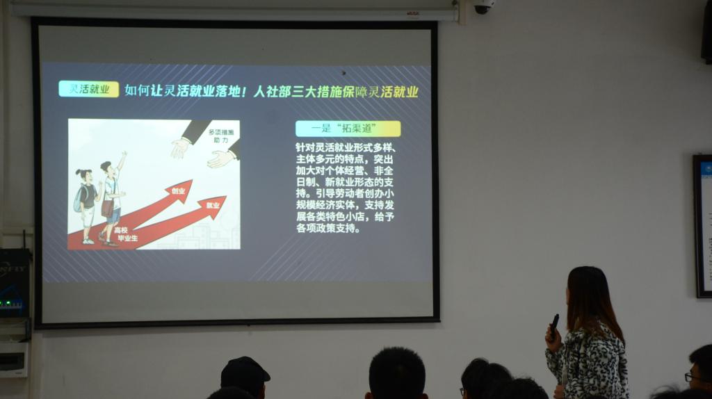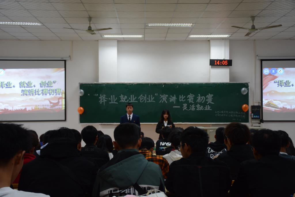 演讲比赛以参赛人抽签顺序进行,参赛人员围绕灵活就业发表演讲,对灵活就业的性质、形式、特点、灵活就业的趋势、灵活就业的压力、技巧、利益等提出自己相应的见解,为在场的同学今后的就业提供了帮助。