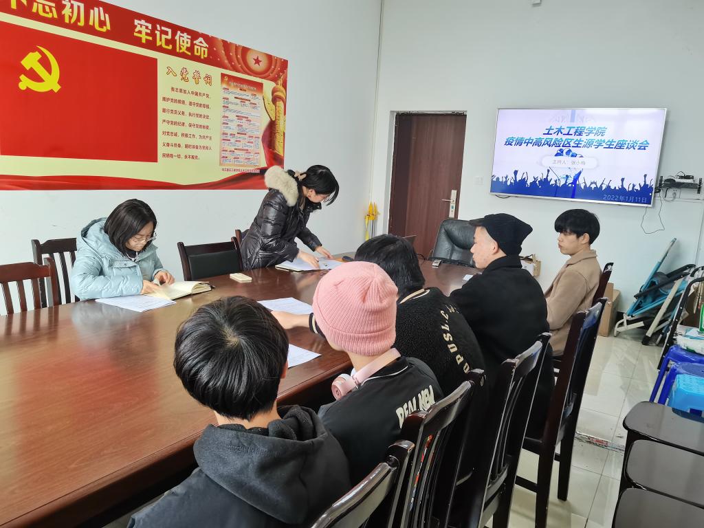 1月11日下午,学院在慎思楼5栋401会议室召开学生座谈会,向全院9名生源地是当前疫情中高风险区的学生表达学校、学院的关心,听取他们目前面临的困难和需求,并对现阶段疫情防控相关信息及防疫政策进行通报。党总支副书记张小梅和相关辅导员现场就相关问题进行了解答。