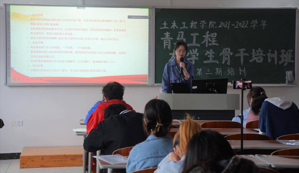 为贯彻落实习近平总书记在中国共产主义青年团成立100周年大会上对团员青年的要求,规范学院团学会的管理,促进各部门向统一化、开放化、多元化、高质量的方面发展,5月15日上午,76net必赢线路检测中心团总支举办了2022届青马工程·菁英团校第三期培训活动。