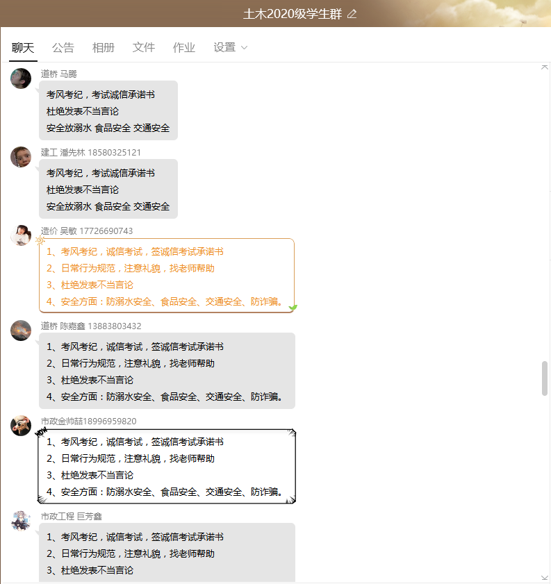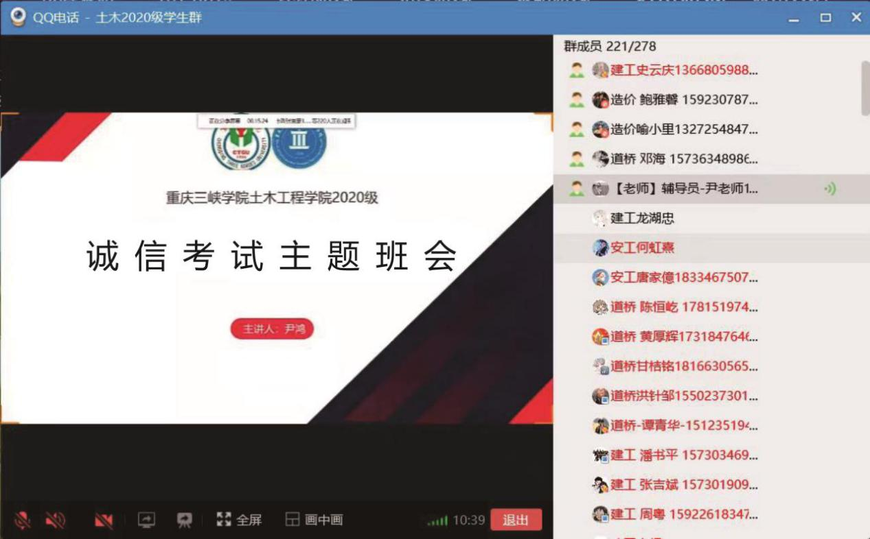 为进一步加强考风考纪教育,增强学生诚信意识,树立良好学习风气,共创良好考试环境,临近期末考试,我院辅导员通过线上和线下的方式纷纷召开诚信考试教育主题班会并进行了签字承诺。