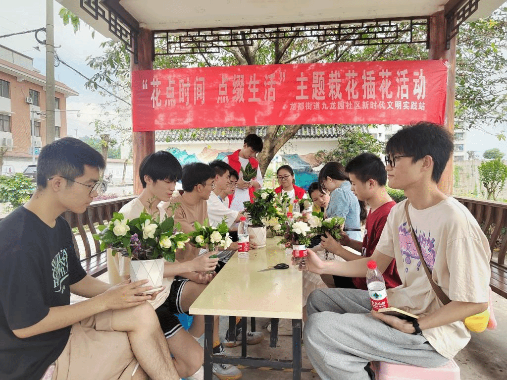 进入社区后,首先志愿者们开展了“以书润心,与文同行”青年读书分享会,围绕党的二十大精神和习近平总书记系列讲话精神,对社区居民进行了宣讲,引导大家深入学习了党的二十大精神,并倡导争做党的坚定拥护者,践行社会主义核心价值观。之后社区专门邀请了花艺老师,用通俗易懂的语言向志愿者们讲解了插花的种类、基本技巧,指导大家如何选材和制作插花,并现场展示了几种经典的插花造型,大家在动手实践过程中体验到了创造美的乐趣。活动在欢快的氛围中有序进行,活动结束后,同学们的插花作品被用于社区绿化装饰。