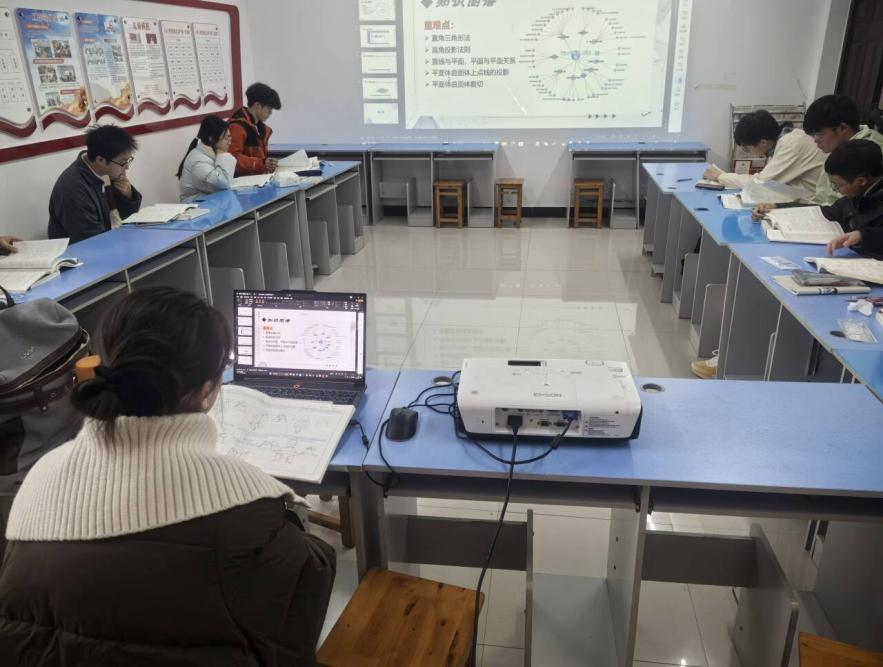 “画法几何与工程制图”是工程类专业的重要基础课程,内容涵盖投影原理、三视图绘制、剖视图表达、制图的基本规定和基本技能等核心知识。由于空间思维要求高、制图规范严谨,该课程一直是2025级学生普遍反映的学习难点。为帮助学生突破课程学习难点,张晓煊老师结合典型例题与工程实例,重点讲解了组合体视图、剖视表达、立体视图、立体投影等学生普遍存在的问题。在互动环节,采取一对一答疑的方式为同学们提供知识点回顾、作业辅导、试题讲解等一系列个性化帮扶举措,积极帮助同学们解决学习上的问题。