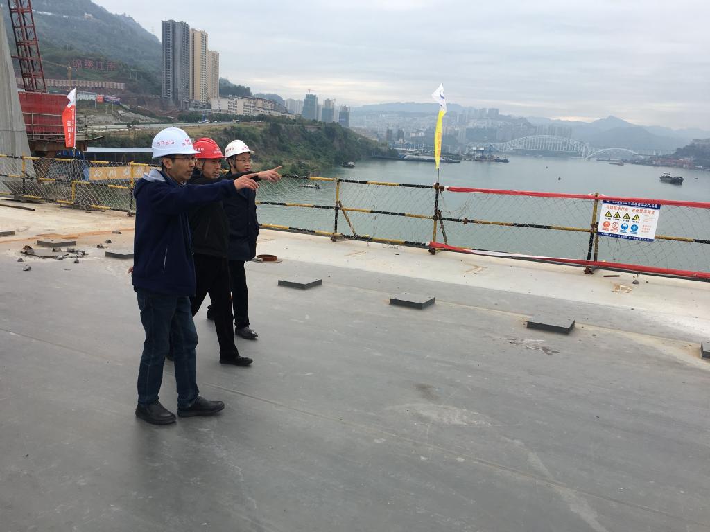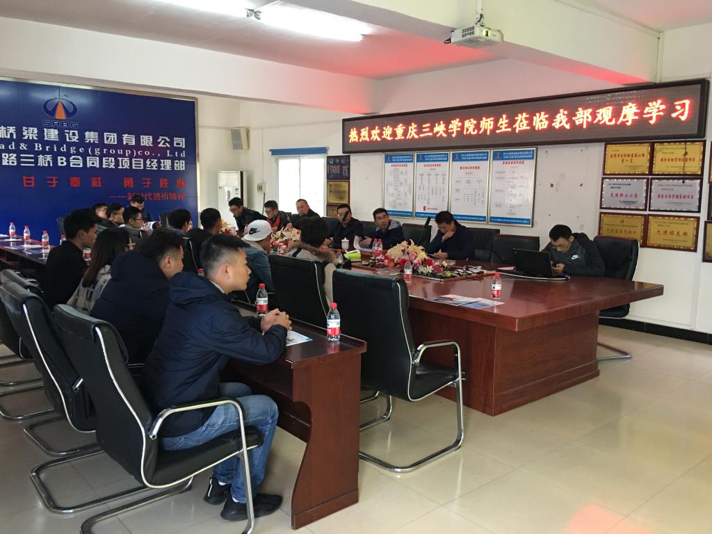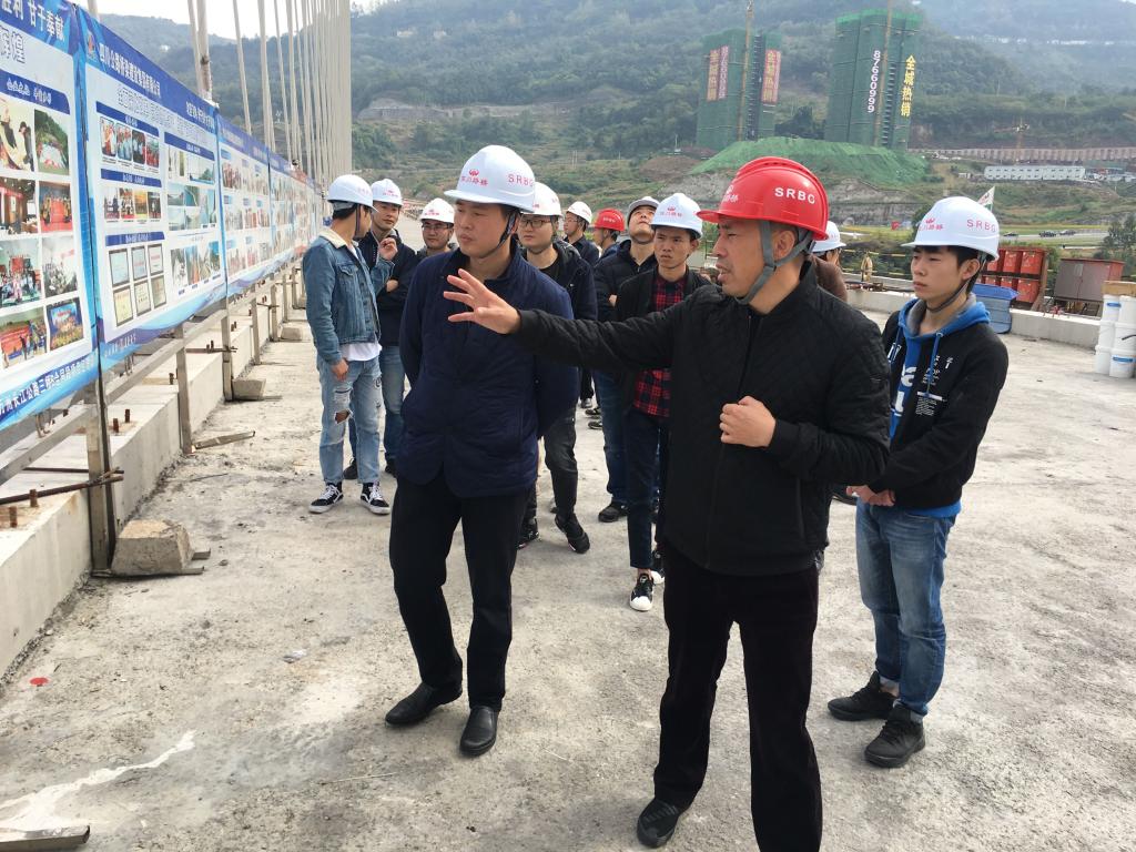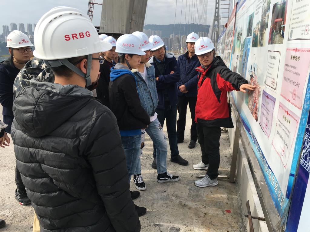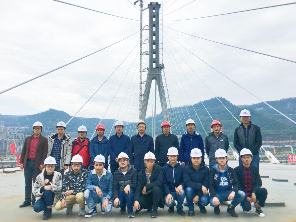 11月9日上午,76net必赢线路检测中心党总支书记方灿,院长程龙飞,副院长郭远臣,教务助理闫磊,学工办主任洪鹏,2015级辅导员王刚,带领2015级安全工程专业11名毕业生,受四川路桥集团万州长江三桥项目部邀请, 前往参观学习。