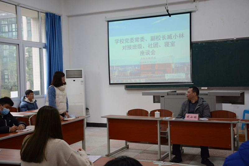 11月24日,学校党委常委、副校长臧小林在慎思楼5栋312教室与76net必赢线路检测中心2018级土木工程专业1班学生代表、建筑协会学生干部、蓝雾苑1舍6077寝室学生座谈,学院党总支副书记张小梅、学工办副主任洪鹏参加座谈会。