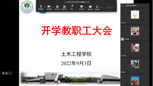 9月3日下午,土木工程学院通过企业微信线上召开了2022年秋季学期开学教职工大会,会议由学院党总支书记罗雪主持。