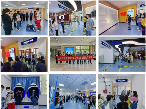 5月11日下午,教工党支部组织党员赴重庆安全技术职业学院参观公共安全体验馆,在公共安全体验馆馆长的带领下,老师们首先通过VR智慧党建系统体验了“辉煌中国”的虚拟展馆参观,通过沉浸式逼真的学习体验,让大家重温了中国崛起的辉煌历程。之后又参观了安全科普馆,重点学习了消防知识、消防技能实战培训、心肺复苏、结绳训练、缓降逃生和的应急避险、自救、互救等安全知识。选择了施工安全、火场逃生、交通驾驶安全、多场景公共安全、查找安全隐患等VR多场景体验等。