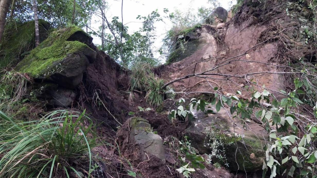 因孤石崩塌滚落,损毁树木形成坡面沟槽,斜坡堆积松散土体约720m3,在降雨条件下易失稳下滑。