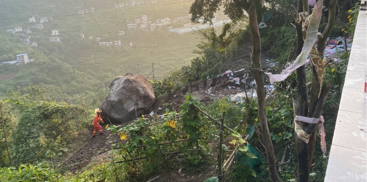 (2)地形地貌:孤石所处斜坡整体坡度较陡,为孤石滚落提供了有利地形条件,且孤石形态大致呈球形,滚落运动距离较长。