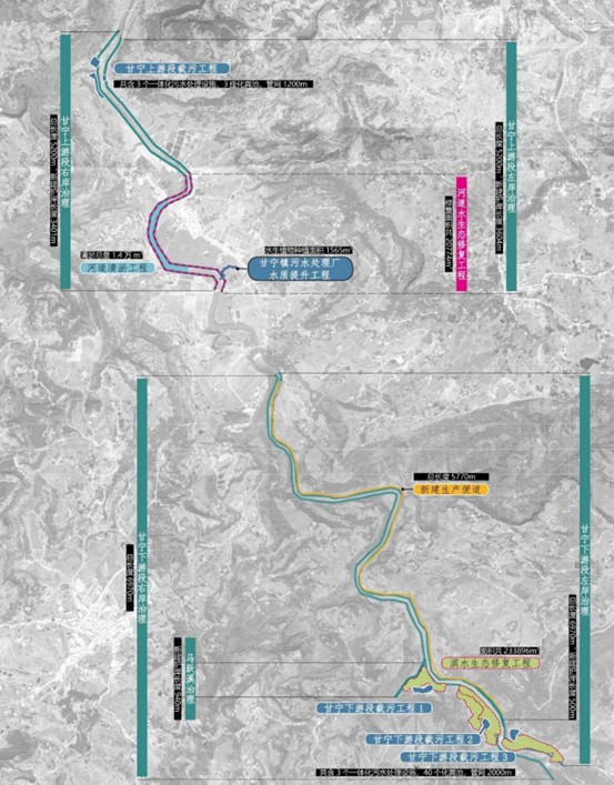 本案例主要建设内容有:生态护岸工程、水生态修复工程、滨水生态修复工程、甘宁镇污水处理厂水质提升工程、河道截污工程及河道清淤工程。