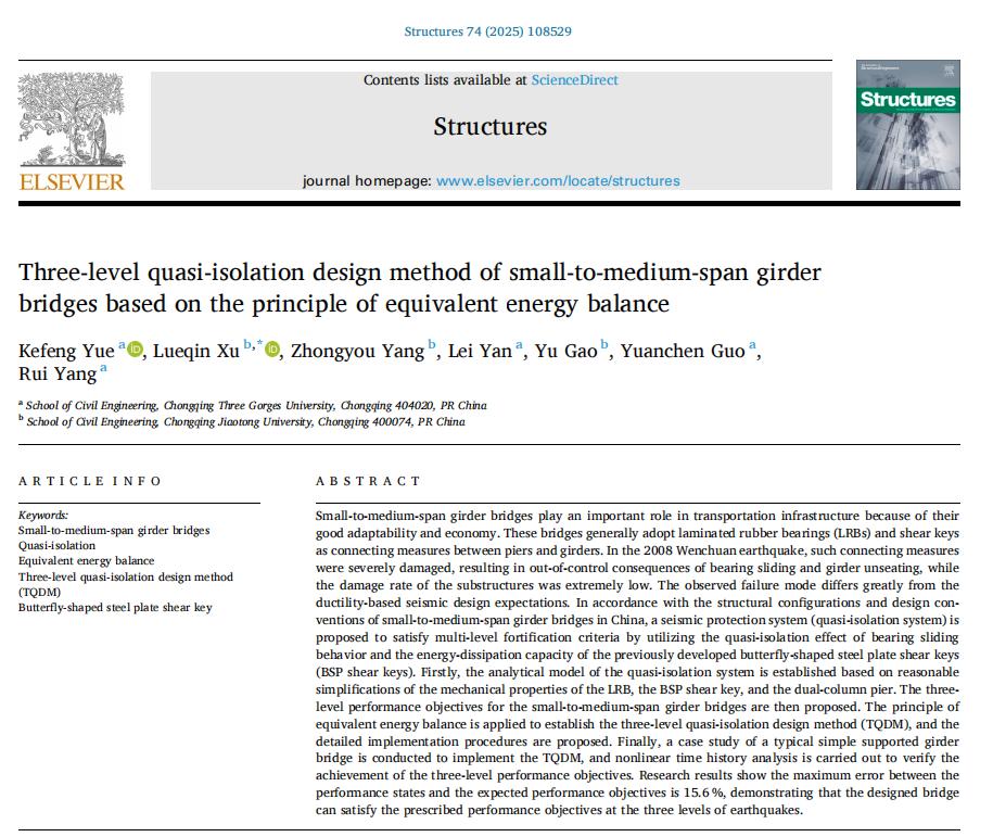 近日,我院教师岳克锋博士以第一作者在桥梁抗震领域中科院2区期刊《Structures》(IF 4.3)发表题为“Three-level Quasi-isolation Design Method of Small-to-medium-span Girder Bridges Based on the Principle of Equivalent Energy Balance”的研究论文。研究根据中国公路梁桥的典型结构配置和设计惯例,提出了一种新型抗震体系(即准隔震体系),并基于等效能量平衡建立了三级准隔震设计方法(TQDM)及实施程序,实现了梁桥多级抗震设防需求。